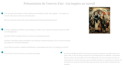 C'est une peinture (huile sur toile) réalisé par David Olère en 1952, elle s'appelle : "Les inaptes au travail', elle mesure 1,31m sur 1,62 de hauteur.Elle est conservée à New York dans le Mémorial de l'héritage juif (Holocauste).