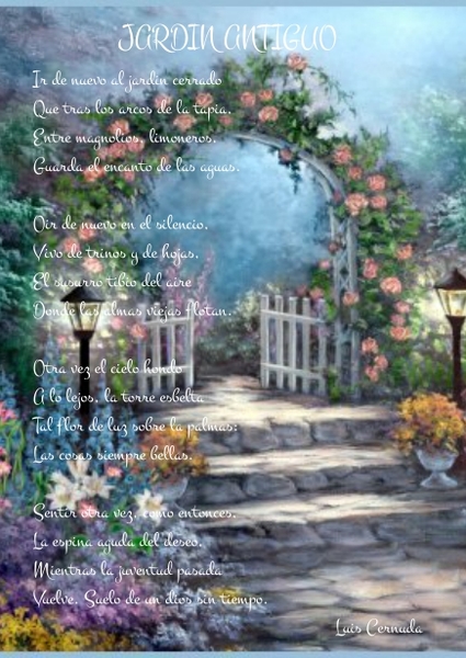 Ir de nuevo al jardin cerradoQue tras los arcos de la tapia, Entre magnolios, limoneros, Guarda el encanto de las aguas. Oir de nuevo en el silencio, Vivo de trinos y de hojas, El susurro tibio del aire Donde las almas viejas flotan. Otra vez el cielo hondo A lo lejos, la torre esbelta Tal flor de luz sobre la palmas: Las cosas siempre bellas. Sentir otra vez, como entonces, La espina aguda del deseo, Mientras la juventud pasada Vuelve. Suelo de un dios sin tiempo. Luis Cernuda