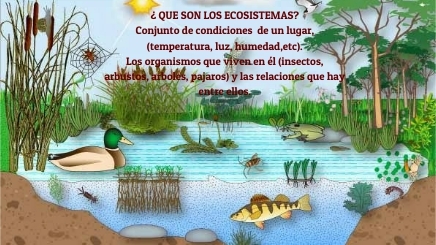 ¿ QUE SON LOS ECOSISTEMAS?Conjunto de condiciones de un lugar, (temperatura, luz, humedad,etc). Los organismos que viven en él (insectos, arbustos, arboles, pajaros) y las relaciones que hay entre ellos.