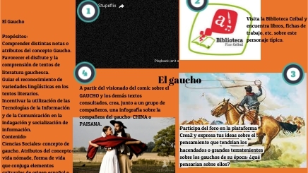 El Gaucho Propósitos:Comprender distintas notas o atributos del concepto Gaucho.Favorecer el disfrute y la comprensión de textos de literatura gauchesca.Guiar el reconocimiento de variedades lingüísticas en los textos literarios.Incentivar la utilización de las Tecnologías de la Información y de la Comunicación en la indagación y socialización de información.Contenido:Ciencias Sociales: concepto de gaucho. Atributos del concepto: vida nómade, forma de vida que conjuga elementos culturales de origen español e indígena. La campaña oriental en la época colonial: Vida del gaucho.Lenguas: Lectura. Textos que narran: Las variedades lingüísticas: el español estándar ripolatense y el habla rural. La poesía: versos y rimas.Textos que explican: La búsqueda bibliográfica en las bibliotecas, librerías y red virtual. Escritura: Textos que narran: El discurso directo en el diálogo. * Las marcas que distinguen al narrador de los pesonajes: verbos conjugados.Literatura: Listado de autores (nacionales): Serafín J. García, Bartolomé Hidalgo. Actividades Detalle de la propuesta:Para desarrollar esta propuesta el docente podrá crear una Unidad Temática en el aula virtual del Aula virtual CREA y en ella incluir algunas de las actividades de esta secuencia.Actividad presencial:Recurrencia a conocimientos abordados en clases anteriores sobre la vida en la campaña oriental en la época colonial.Indagación de ideas o conocimientos previos sobre la vida del gaucho. Se les preguntará a los alumnos: ¿Qué saben de los gauchos? ¿En qué época se los puede ubicar? ¿Cómo se vestían? ¿Dónde vivían? ¿Cómo vivían? ¿De qué vivían? ¿Cómo serían vistos por los europeos?, etc.A continuación el docente presentará tres fragmentos de distintos documentos históricos sobre la vida de los gauchos (ver archivo adjunto "Documenos históricos sobre el gaucho"). Se promoverá la exploración de conocimientos previos acerca de qué información podemos encontrar en los textos. Anticipaciones y predicciones lectoras en base a paratextos, son algunas de las estrategias que puede realizar el maestro en esta etapa. La información sobre los textos se registrará en un cuadro utilizando la aplicación Escribir de la XO. Realización de la lectura del texto. Identificación de información explícita relevante a efectos de lo que esperábamos encontrar en el texto. Registro de nueva información en el cuadro y procesamiento de los datos.Actividad virtual:En otro momento, los alumnos, organizados en pequeños grupos, deberán elaborar colaborativamente un mapa conceptual o esquema, que organice la información a partir de tres nociones básicas: ocupaciones, vestimenta y alimentación, mediante la Actividad Cmap Tools de la XO o a través de la herramienta en línea Cacoo. Posteriormente, pueden compartir sus producciones en el blog de la escuela a través de la plataforma CREA.Actividad presencial:El maestro abordará con los alumnos la figura del gaucho en la literatura. Se explorarán libros traídos por los niños u obtenidos mediante préstamo en bibliotecas, relacionados con la temática del gaucho. El docente guiará la identificación de los autores, títulos y otros paratextos. Se privilegia, en esta instancia, la lectura placentera de poemas de Bartolomé Hidalgo y de Serafín J. García. También puede realizarse la lectura de crónicas de Serafín J. GarcíaActividad virtual:En pequeños grupos, los alumnos realizarán una indagación acerca de datos biográficos de los autores. A partir de la actividad Navegar de la XO, se realizarán búsquedas en Internet. El docente podrá intervenir sugiriendo sitios con reconocimiento académico, que nos permitan tener información fiable, ayudando a identificar los hipervínculos relevantes y guiando la reflexión sobre contenidos de carácter publicitario.En la medida en que se realizan las búsquedas, los estudiantes podrán extraer información relevante sobre los autores y el contexto de producción de su obra, extraída de sitios, artículos, etc. Pueden registrarse las informaciones en la actividad Escribir y guardarse las imágenes con derechos permitidos de los autores, tapas de los libros, etc.Se sugiere la visita a dos efemérides del portal Uruguay Educa que proporcionan información y reúnen recursos educativos digitales de estos autores:Efeméride de Bartolomé HidalgoEfeméride de Serafín J. García Serafín J. García y monumento a Bartolomé HidalgoAsimismo, se recomiendan especialmente estos objetos de aprendizaje del portal Ceibal, en los que se brinda información acerca de los mencionados escritores y se integran otros recursos digitales.