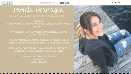 ESTIMADO/A:TENGO EL AGRADO DE DIRIGIRME A USTED PARA EVENTUALES BÚSQUEDAS ACORDES A MI PERFIL. SOY UNA PERSONA ACTIVA, RESPONSABLE, CREATIVA, FLEXIBLE, ORIENTADAAL LOGRO DE RESULTADOS EN CUANTO A MI FORMACIÓN, ESTOY EN TERMINANDO MI SEGUNDO AÑO DE LA CARRERA LICENCIATURA DE GESTIÓN DE MEDIOS Y ENTRETENIMIENTO EN UADE ESTIMO QUE UNA ENTREVISTA SERÁ EL MARCO ADECUADO PARA PROFUNDIZAR ASPECTOS DE MI PERFIL QUE PUEDAN RESULTAR DE SU INTERÉS. QUEDANDO A LA ESPERA DE SU RESPUESTA.ATENTAMENTE, DANIELA GRAMAGLIA