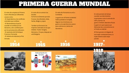 En este año empieza la Primera Guerra Mundial por diferentes causas como:-El Imperialismo y los conflictos coloniales que conlleva-El Nacionalismo al que le suceden el conflicto en los balcanes y otro conflicto pero por los procesos de unificacion.-El asesinato del Archiduque Francisco Fernando.-El sistema de alianzas,La Paz Armada.