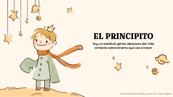 Sumérgete en el mundo del Principito con esta plantilla gratuita. Crea presentaciones inspiradoras y encantadoras basadas en la famosa obra literaria. Personaliza el diseño y comparte mensajes cautivadores.