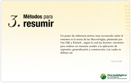 Un punto de referencia teórica muy reconocido sobre el resumen es la teoría de las Macrorreglas, planteado por Van Dijk y Kintsch , según la cual los lectores- escritores para realizar un resumen acuden a la aplicación de: supresión, generalización y construcción. Las cuales se definen así: