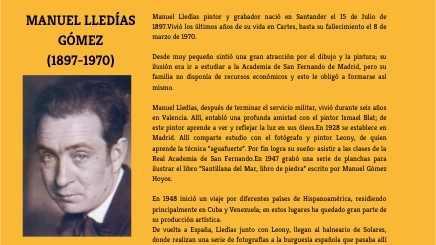Manuel Lledías pintor y grabador nació en Santander el 15 de Julio de 1897.Vivió los últimos años de su vida en Cartes, hasta su fallecimiento el 8 de marzo de 1970.Desde muy pequeño sintió una gran atracción por el dibujo y la pintura; su ilusión era ir a estudiar a la Academia de San Fernando de Madrid, pero su familia no disponía de recursos económicos y esto le obligó a formarse así mismo.Manuel Lledías, después de terminar el servicio militar, vivió durante seis años en Valencia. Allí, entabló una profunda amistad con el pintor Ismael Blat; de este pintor aprende a ver y reflejar la luz en sus óleos.En 1928 se establece en Madrid. Allí comparte estudio con el fotógrafo y pintor Leony, de quien aprende la técnica “aguafuerte”. Por fin logra su sueño: asistir a las clases de la Real Academia de San Fernando.En 1947 grabó una serie de planchas para ilustrar el libro “Santillana del Mar, libro de piedra” escrito por Manuel Gómez Hoyos.En 1948 inició un viaje por diferentes países de Hispanoamérica, residiendo principalmente en Cuba y Venezuela; en estos lugares ha quedado gran parte de su producción artística.De vuelta a España, Lledías junto con Leony, llegan al balneario de Solares, donde realizan una serie de fotografías a la burguesía española que pasaba allí sus vacaciones.