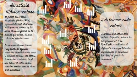 Si passes per sobre dels colors d'aquesta pintura, la Composició nº 7 de Kandinski, escoltaràs els diferents sons que l'Amelia experimenta en observar-los. Sent el que és la sinestèsia!
