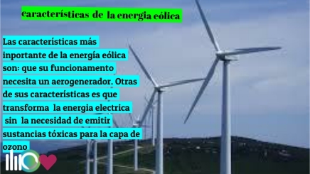 Las características más inportante de la energía eólica son: que su funcionamento necesita un aerogenerador. Otras de sus características es que transforma la energia electrica sin la necesidad de emitir sustancias tóxicas para la capa de ozono