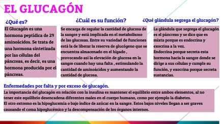El Glucagón es una hormona peptídica de 29 aminoácidos. Se trata de una hormona sintetizada por las células del páncreas, es decir, es una hormona producida por el páncreas.