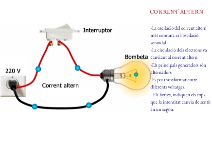 -La oscilació del corrent altern més comuna es l'oscilació senoidal -La circulació dels electrons va canviant al corrent altern -Els principals generadors són alternadors -Es pot transformar entre diferents voltatges. - Els hertzs, indiquen els copsque la intensitat canvia de sentit en un segon.