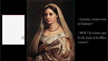 - Lorenzo, croyez-vous en l'amour ?- MOI ? Je n'aime que le vin, le jeu et les filles, voyons !