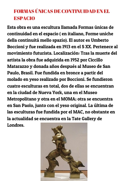 Esta obra es una escultura llamada Formas únicas de continuidad en el espacio ( en italiano, Forme uniche della continuitá mello spazio). El autor es Umberto Boccioni y fue realizada en 1913 en el S XX. Pertenece al movimiento futurista. Localización: Tras la muerte del artista la obra fue adquirida en 1952 por Ciccillo Matarazzo y donada años después al Museo de San Paulo, Brasil. Fue fundida en bronce a partir del molado en yeso realizado por Boccioni. Se fundieron cuatro esculturas en total, dos de ellas se encuentran en la ciudad de Nueva York, una en el Museo Metropolitano y otra en el MOMA; otra se encuentra en San Paolo, junto con el yeso original. La última de las esculturas fue fundida por el MAC, no obstante en la actualidad se encuentra en la Tate Gallery de Londres.