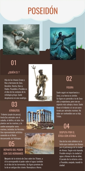 Hijo de los titanes Crono y Rea y hermano de Zeus, Deméter, Hestia, Hera y Hades. Poseidón o Posidón es el dios de los océanos de la mitología griega. Suele desplazarse en una cuadriga .