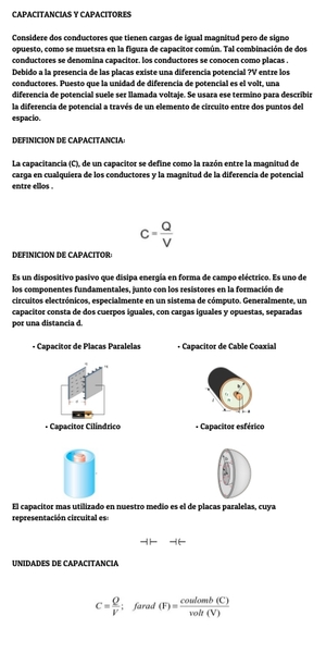 CAPACITANCIAS Y CAPACITORESConsidere dos conductores que tienen cargas de igual magnitud pero de signo opuesto, como se muetsra en la figura de capacitor común. Tal combinación de dos conductores se denomina capacitor. los conductores se conocen como placas . Debido a la presencia de las placas existe una diferencia potencial ?V entre los conductores. Puesto que la unidad de diferencia de potencial es el volt, una diferencia de potencial suele ser llamada voltaje. Se usara ese termino para describir la diferencia de potencial a través de un elemento de circuito entre dos puntos del espacio.DEFINICION DE CAPACITANCIA:La capacitancia (C), de un capacitor se define como la razón entre la magnitud de carga en cualquiera de los conductores y la magnitud de la diferencia de potencial entre ellos .DEFINICION DE CAPACITOR:Es un dispositivo pasivo que disipa energía en forma de campo eléctrico. Es uno de los componentes fundamentales, junto con los resistores en la formación de circuitos electrónicos, especialmente en un sistema de cómputo. Generalmente, un capacitor consta de dos cuerpos iguales, con cargas iguales y opuestas, separadas por una distancia d. • Capacitor de Placas Paralelas • Capacitor de Cable Coaxial • Capacitor Cilíndrico • Capacitor esféricoEl capacitor mas utilizado en nuestro medio es el de placas paralelas, cuya representación circuital es:UNIDADES DE CAPACITANCIA