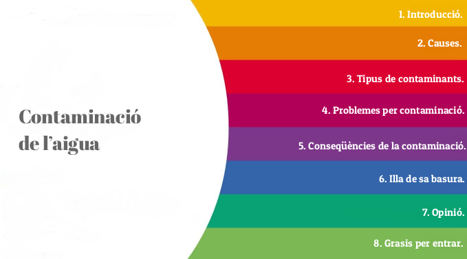 Crec que la contaminació abarca moltes rames, aigua, atamosfera... però una de les més importants es l'aigua, uns del recursos més importants que afavoreixen la vida i molts de procesos químics. No podem oblidar que els essers humans provenim de l'aigua.