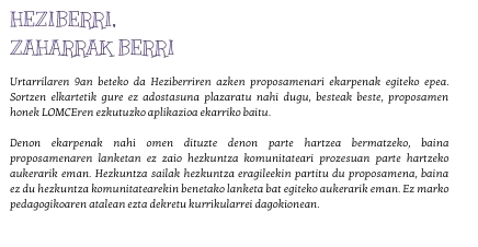 Heziberri prozesu parte hartzaile eta babes zabalenarekin irudikatzen zuten hau. Zerotik abiatzen ez zen prozesua zela ere esan zuten, egun martxan dauden hainbat proiektu eta egitasmo kontutan izango zituelako. Hala ere Curriculum honek LOMCE du ardatz. Beste itxura batekin aurkeztutako LOMCE lege bat da. Bai ikasketen antolakuntzan, bai ikasgaiei begira, baita curriculumean ere. Hezkuntza sailak lege honen aurrean beti izan duen jarrera mantendu du dekretu berria idazterakoan. Hau da, bete beharreko legea dela. Askotan maila abstraktuan eta zehaztugabean aritzen da, itxura eta asmo oneko formulazio teorikoetan, baina Euskal Herriaren beharrak aztertu, aipatu eta jorratu gabe. Zehaztapen falta horretan hainbat gaiekin kezkatuta gaude: hezkidetzan, euskal kulturaren definizioan, konpetentziak zertarako eta nola… Proposamena bera gaztelaniaz sortu izanak ere kezka handia sortzen digu.