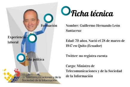 Nombre: Guillermo Hernando León Santacruz Edad: 70 años. Nació el 28 de marzo de 1947 en Quito (Ecuador) Twitter: no registra cuenta Cargo: Ministro de Telecomunicaciones y de la Sociedad de la Información