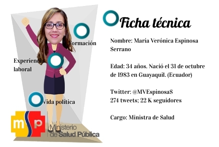 Nombre: María Verónica Espinosa Serrano Edad: 34 años. Nació el 31 de octubre de 1983 en Guayaquil. (Ecuador) Twitter: @MVEspinosaS 274 tweets; 22 K seguidores Cargo: Ministra de Salud