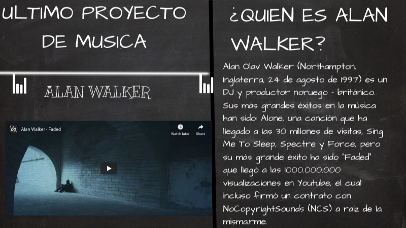 Alan Olav Walker (Northampton, Inglaterra, 24 de agosto de 1997) es un DJ y productor noruego - británico. Sus más grandes éxitos en la música han sido: Alone, una canción que ha llegado a las 30 millones de visitas, Sing Me To Sleep, Spectre y Force, pero su más grande éxito ha sido "Faded" que llegó a las 1000.000.000 visualizaciones en Youtube, el cual incluso firmó un contrato con NoCopyrightSounds (NCS) a raíz de la misma.rme.