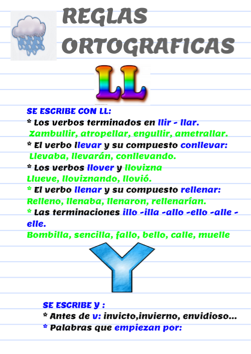 SE ESCRIBE CON LL:* Los verbos terminados en llir - llar. Zambullir, atropellar, engullir, ametrallar. * El verbo llevar y su compuesto conllevar: Llevaba, llevarán, conllevando. * Los verbos llover y llovizna Llueve, lloviznando, llovió. * El verbo llenar y su compuesto rellenar: Relleno, llenaba, llenaron, rellenarían. * Las terminaciones illo -illa -allo -ello -alle -elle. Bombilla, sencilla, fallo, bello, calle, muelle