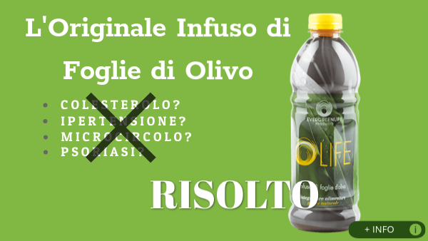 Olife è l’esclusivo integratore alimentare a base di OLIVUM®, l’Infuso di Foglie d’ Olivo brevettato da Evergreen Life Products, e fiori di Calendula Officinalis. Grazie ad uno speciale processo di lavorazione, completamente naturale, vengono estratti, nel totale rispetto della pianta, i principi attivi presenti nelle foglie d’olivo. Olife è ricco di molecole, tra le quali: l’Oleuropeina, l’Acido Elenolico, la Rutina, il Tirosolo ed il potente antiossidante Idrossitirosolo, e di principi attivi molto salutari. Olife contine il 93% di OLIVUM®, rivelandosi un autentico gioiello della fitoterapia tradizionale che da anni gode della fiducia di migliaia di clienti soddisfatti. Si consiglia di consumare almeno 70 ml al giorno (pari a mezzo bicchiere) puro o diluito.