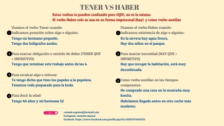 Estos verbos te pueden confundir pero ¡OJO!, no es lo mismo.El verbo Haber solo se usa en su forma impersonal (hay) y como verbo auxiliar