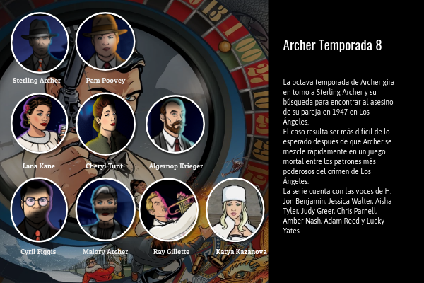 La octava temporada de Archer gira en torno a Sterling Archer y su búsqueda para encontrar al asesino de su pareja en 1947 en Los Ángeles. El caso resulta ser más difícil de lo esperado después de que Archer se mezcle rápidamente en un juego mortal entre los patrones más poderosos del crimen de Los Ángeles. La serie cuenta con las voces de H. Jon Benjamin, Jessica Walter, Aisha Tyler, Judy Greer, Chris Parnell, Amber Nash, Adam Reed y Lucky Yates..