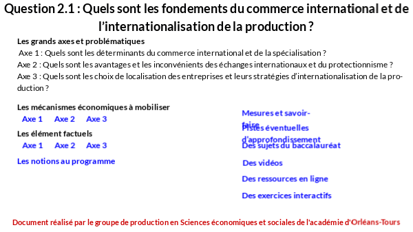 Les grands axes et problématiques Axe 1 : Quels sont les déterminants du commerce international et de la spécialisation ? Axe 2 : Quels sont les avantages et les inconvénients des échanges internationaux et du protectionnisme ? Axe 3 : Quels sont les choix de localisation des entreprises et leurs stratégies d’internationalisation de la pro-duction ?