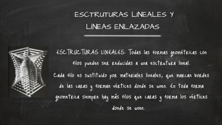 ESTRUCTURAS LINEALES: Todas las formas geométricas con filos pueden ser reducidas a una esctrutura lineal. Cada filo es sustituido por materiales lineales, que marcan bordes de las caras y forman vértices donde se unen. En toda forma geometrica siempre hay más filos que caras y forma los vértices donde se unen.