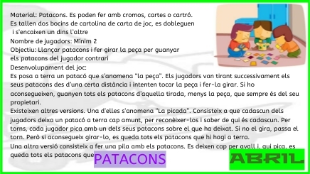 Material: Patacons. Es poden fer amb cromos, cartes o cartró. Es tallen dos bocins de cartolina de carta de joc, es dobleguen i s’encaixen un dins l’altre Nombre de jugadors: Mínim 2 Objectiu: Llançar patacons i fer girar la peça per guanyar els patacons del jugador contrari Desenvolupament del joc: Es posa a terra un patacó que s’anomena “la peça”. Els jugadors van tirant successivament els seus patacons des d’una certa distància i intenten tocar la peça i fer-la girar. Si ho aconsegueixen, guanyen tots els patacons d’aquella tirada, menys la peça, que sempre és del seu propietari. Existeixen altres versions. Una d’elles s’anomena “La picada”. Consisteix a que cadascun dels jugadors deixa un patacó a terra cap amunt, per reconèixer-los i saber de qui és cadascun. Per torns, cada jugador pica amb un dels seus patacons sobre el que ha deixat. Si no el gira, passa el torn. Però si aconsegueix girar-lo, es queda tots els patacons que hi hagi a terra. Una altra versió consisteix a fer una pila amb els patacons. Es deixen cap per avall i, qui pica, es queda tots els patacons que aconsegueixi girar.