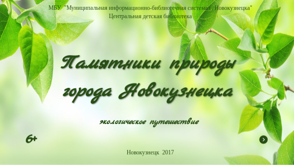 Памятники природы города Новокузнецка [Электронный ресурс] : экологическое путешествие : 6+ / [авт.-сост. Ирина Баркова ; оформ. Ирина Баркова] ; МБУ «Муниципальная информационно-библиотечная система г. Новокузнецка», Центральная детская библиотека. - Электрон. дан. - Новокузнецк, 2017.