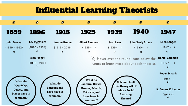 Hover over the round icons below the years to learn more about each theorist.