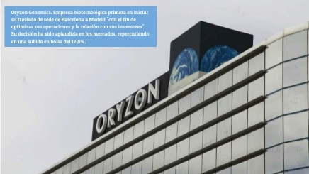 Oryzon Genomics. Empresa biotecnológica primera en iniciar su traslado de sede de Barcelona a Madrid "con el fin de optimizar sus operaciones y la relación con sus inversores". Su decisión ha sido aplaudida en los mercados, repercutiendo en una subida en bolsa del 12,8%.