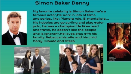 My favorite celebrity is Simon Baker he's a famous actor,He work in lots of films and series, like: Planeta rojo, El mentalista… His hobbies are go surfing and play water polo, he was a champion.He likes read and travel, he doesn’t like the people who is ignorant.He loves stay with his family: Rebecca his wife and his child Harry, Claude and Stella