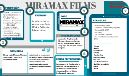 - Fundada por los hermanos Harvey y Bob Weinstein en 1979, Nueva York.- Bautizada a raíz de la combinación de los nombres de sus padres, Max y Miriam. - COMIENZOS - Empresa dirigida a la distribución de películas independientes.- Distribución de películas europeas, hasta que en 1989 comenzó a producir películas.