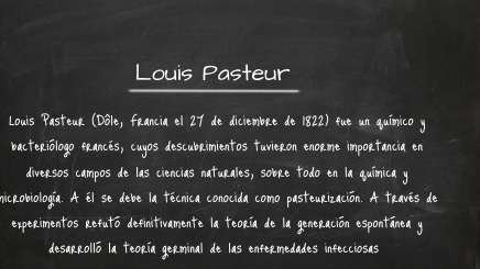 Louis Pasteur (Dôle, Francia el 27 de diciembre de 1822) fue un químico y bacteriólogo francés, cuyos descubrimientos tuvieron enorme importancia en diversos campos de las ciencias naturales, sobre todo en la química y microbiología. A él se debe la técnica conocida como pasteurización. A través de experimentos refutó definitivamente la teoría de la generación espontánea y desarrolló la teoría germinal de las enfermedades infecciosas