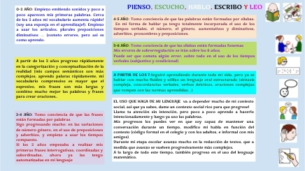 4-5 AÑO: Tomo conciencia de que las palabras están formadas por sílabas. En mi forma de hablar ya tengo totalmente incorporada el uso de los tiempos verbales, el número, el género, aumentativos y diminutivos, adverbios, pronombres y preposiciones.