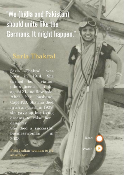 Sarla Thakral was born in 1914. She earned her aviation pilot's license at the age of 21 and flew solo. After her husband, Capt P.D. Sharma died in an air crash in 1939, she gave up her flying dreams to raise her daughter. She died a successful businesswoman in 2008.