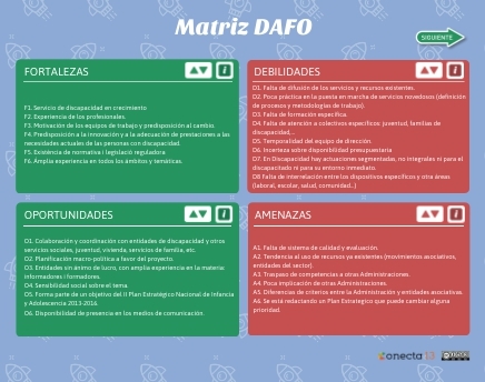 O1. Colaboración y coordinación con entidades de discapacidad y otros servicios sociales, juventud, vivienda, servicios de familia, etc. O2. Planificación macro-política a favor del proyecto. O3. Entidades sin ánimo de lucro, con amplia experiencia en la materia: informadores i formadores. O4. Sensibilidad social sobre el tema. O5. Forma parte de un objetivo del II Plan Estratégico Nacional de Infancia y Adolescencia 2013-2016. O6. Disponibilidad de presencia en los medios de comunicación.