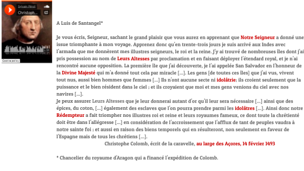 A Luis de Santangel*Je vous écris, Seigneur, sachant le grand plaisir que vous aurez en apprenant que Notre Seigneur a donné une issue triomphante à mon voyage. Apprenez donc qu'en trente-trois jours je suis arrivé aux Indes avec l'armada que me donnèrent mes illustres seigneurs, le roi et la reine. J'y ai trouvé de nombreuses îles dont j'ai pris possession au nom de Leurs Altesses par proclamation et en faisant déployer l'étendard royal, et je n'ai rencontré aucune opposition. La première île que j'ai découverte, je l'ai appelée San Salvador en l'honneur de la Divine Majesté qui m'a donné tout cela par miracle [...]. Les gens [de toutes ces îles] que j'ai vus, vivent tout nus, aussi bien hommes que femmes [...] Ils n'ont aucune secte ni idolâtrie; ils croient seulement que la puissance et le bien résident dans le ciel ; et ils croyaient que moi et mes gens venions du ciel avec nos navires [...].Je peux assurer Leurs Altesses que je leur donnerai autant d'or qu'il leur sera nécessaire [...] ainsi que des épices, du coton, [...] également des esclaves que l'on pourra prendre parmi les idolâtres [...]. Ainsi donc notre Rédempteur a fait triompher nos illustres roi et reine et leurs royaumes fameux, ce dont toute la chrétienté doit être dans l'allégresse [...] en considération de l'accroissement que l'afflux de tant de peuples vaudra à notre sainte foi ; et aussi en raison des biens temporels qui en résulteront, non seulement en faveur de l'Espagne mais de tous les chrétiens [...]. Christophe Colomb, écrit de la caravelle, au large des Açores, 14 février 1493* Chancelier du royaume d'Aragon qui a financé l'expédition de Colomb.