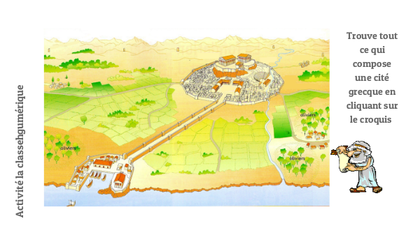 Trouve tout ce qui compose une cité grecque en cliquant sur le croquis