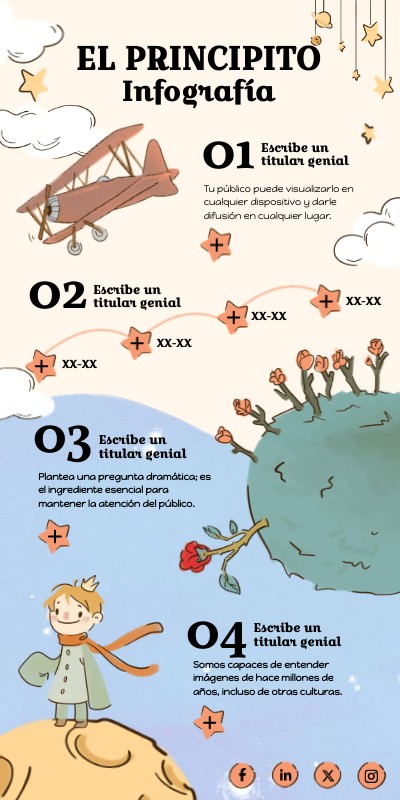 Una infografía inspirada en El Principito. Ideal para presentar resúmenes de libros, trabajos escolares, o explorar la literatura de una forma creativa y visual. Descargable, editable y perfecta para el alumnado.