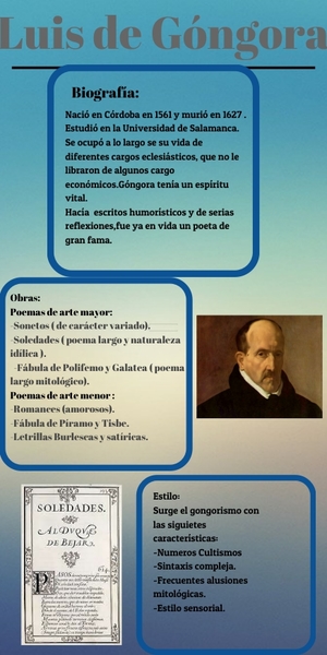 Nació en Córdoba en 1561 y murió en 1627 . Estudió en la Universidad de Salamanca. Se ocupó a lo largo se su vida de diferentes cargos eclesiásticos, que no le libraron de algunos cargo económicos.Góngora tenía un espíritu vital.Hacía escritos humorísticos y de serias reflexiones,fue ya en vida un poeta de gran fama.