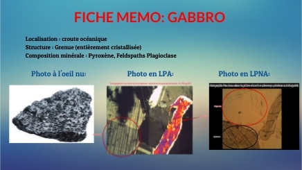 Localisation : croute océanique Structure : Grenue (entièrement cristallisée) Composition minérale : Pyroxène, Feldspaths Plagioclase