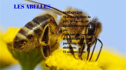 DESCRIPCION:Té el cos recobert de pèls, té 6 potes, un agulló i mesura uns 2 cm. Com tots els insectes té el cos dividit en tres parts: cap, tòrax i abdomen. Té ales per volar.