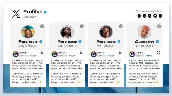Use this free template to select and showcase prominent profiles on X. Add their profile photos, follower count, direct links, and other relevant account details.