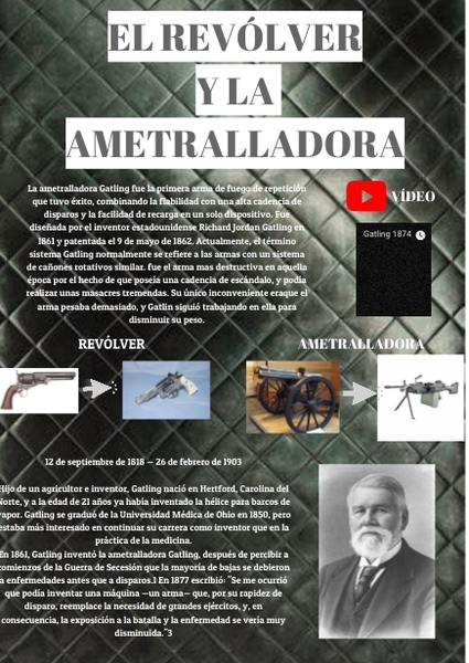 La ametralladora Gatling fue la primera arma de fuego de repetición que tuvo éxito, combinando la fiabilidad con una alta cadencia de disparos y la facilidad de recarga en un solo dispositivo. Fue diseñada por el inventor estadounidense Richard Jordan Gatling en 1861 y patentada el 9 de mayo de 1862. Actualmente, el término sistema Gatling normalmente se refiere a las armas con un sistema de cañones rotativos similar. fue el arma mas destructiva en aquella época por el hecho de que poseía una cadencia de escándalo, y podía realizar unas masacres tremendas. Su único inconveniente eraque el arma pesaba demasiado, y Gatlin siguió trabajando en ella para disminuir su peso.