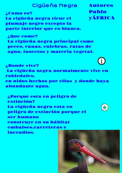 ¿Por qué esta en peligro de extinción?La cigüeña negra esta en peligro de extinción porque el ser humano construye en su hábitat embalses,carreteras e incendios.