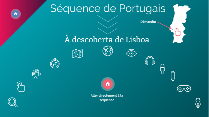 La séquence - dont nous ne détaillerons ici que les 3 premières séances - se déroule en Espace Langues. La salle, équipée d’outils numériques et de mobilier modulaire, autorise la différenciation dans le lieu, grâce à la disposition en îlots, mais nous ouvrirons la première séance en « classe entière » par une « entrée géographique, de nos jours » au moyen d’une photo panoramique à 360° de la « Praça do Comércio ». Cette « promenade virtuelle », projetée au vidéoprojecteur et menée au bureau du professeur par des élèves volontaires, débute sur ce lieu emblématique de Lisbonne, donnant lieu à un échange oral visant à réactiver le lexique de la ville déjà connu. Elle sera accompagnée de différents « portefeuilles lexicaux », classés par thèmes et par difficultés, permettant d'introduire et de fixer le vocabulaire nouveau. (Palácio/Paço, praça/terreiro, igreja/catedral/Sé...) Puis les binômes seront dirigés en ateliers vers différentes activités d'entraînement à réaliser aux ordinateurs. Pour la séance suivante, ils devront apprendre le vocabulaire et finaliser les tâches commencées en classe.