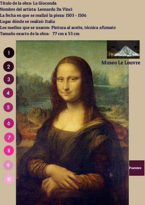 Título de la obra: La Gioconda Nombre del artista: Leonardo Da Vinci La fecha en que se realizó la pieza: 1503 - 1506 Lugar dónde se realizó: Italia Los medios que se usaron: Pintura al aceite, técnica sfumato Tamaño exacto de la obra: 77 cm x 53 cm