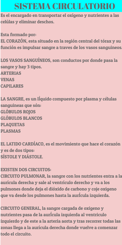 Es el encargado en transportar el oxígeno y nutrientes a las celúlas y eliminar deschos.Esta formado por: EL CORAZÓN, esta situado en la región central del tórax y su función es impulsar sangre a traves de los vasos sanguineos. LOS VASOS SANGUÍNEOS, son conductos por donde pasa la sangre y hay 3 tipos. ARTERIAS VENAS CAPILARES LA SANGRE, es un lÍquido compuesto por plasma y células sanguineas que són: GLÓBULOS ROJOS GLÓBULOS BLANCOS PLAQUETAS PLASMAS EL LATIDO CARDÍACO, es el movimiento que hace el corazón y es de dos tipos: SÍSTOLE Y DIÁSTOLE. EXISTEN DOS CIRCUITOS: CIRCUITO PULMONAR, la sangre con los nutrientes entra a la aurícula derecha y sale al ventrículo derecho y va a los pulmones donde deja el dióxido de carbono y coje oxigeno que va desde los pulmones hasta la aurÍcula izquierda. CIRCUITO GENERAL, la sangre cargada de oxigeno y nutrientes pasa de la aurÍcula izquierda al ventriculo izquierdo y de este a la arteria aorta y tras recorrer todas las zonas llega a la aurícula derecha donde vuelve a comenzar todo el circuito.